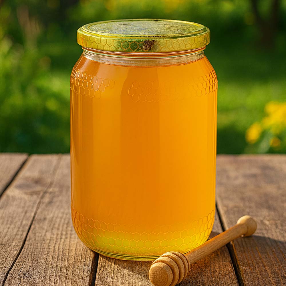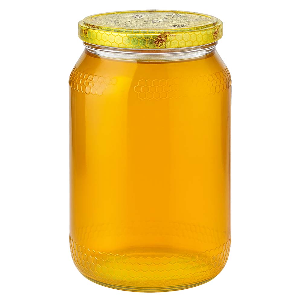 Szklany słoik na miód o pojemności 1260 g z ozdobnym wieczkiem w plaster miodu BasicSeal UNiTWIST. Dekoracyjny motyw podkreśla naturalność produktu i doskonale sprawdza się przy dużych porcjach oraz sprzedaży bezpośredniej.