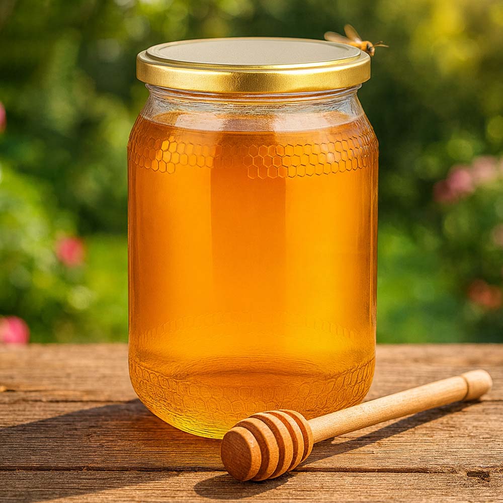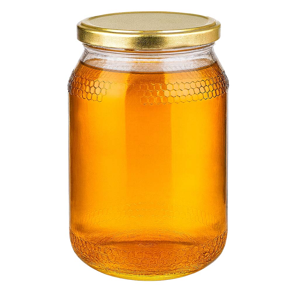 Szklany słoik na miód o pojemności 1260 g ze złotą zakrętką BasicSeal UNiTWIST. Doskonały do rodzinnych porcji, dużych ilości miodu oraz sprzedaży bezpośredniej. Złota zakrętka podkreśla wysoką jakość produktu.