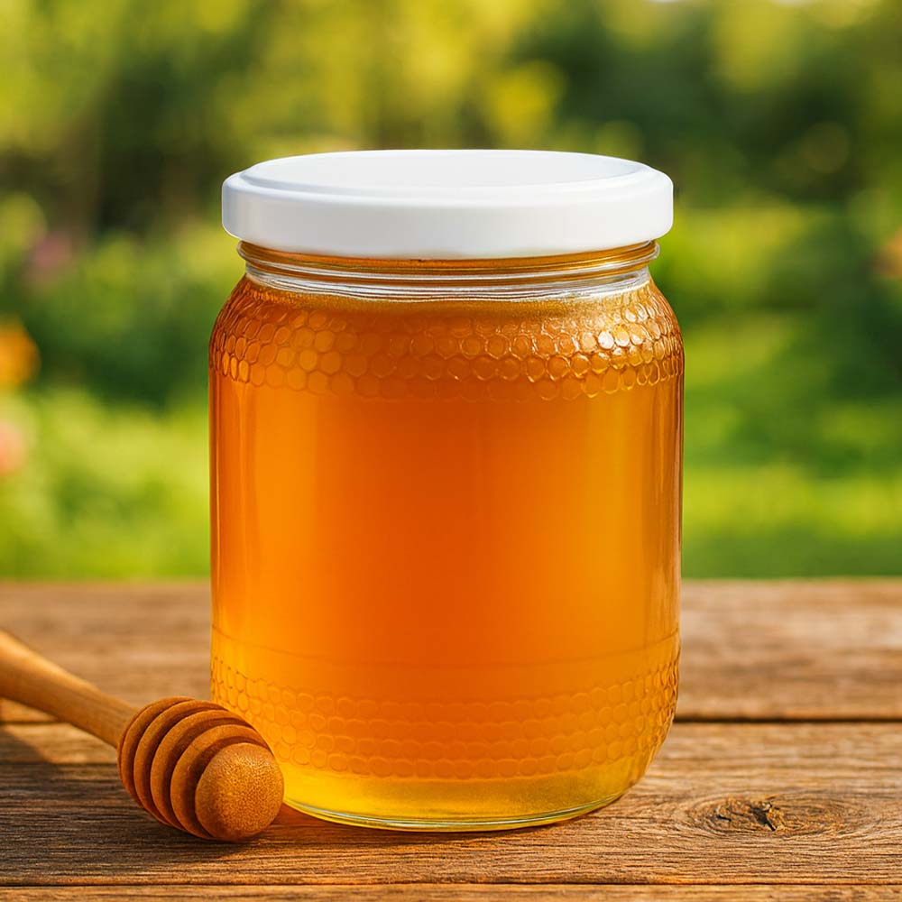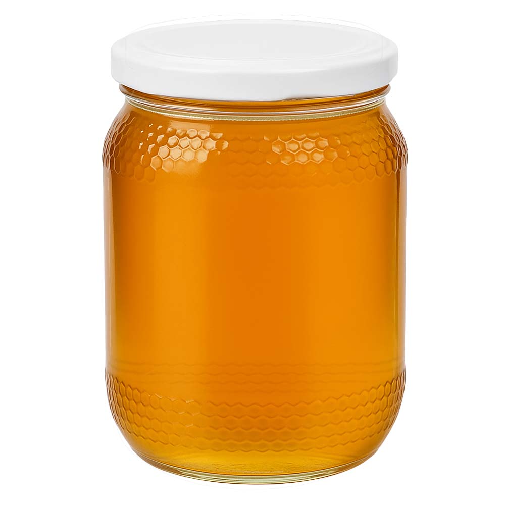Szklany słoik na miód o pojemności 1260 g z minimalistyczną, białą zakrętką BasicSeal UNiTWIST. Doskonały wybór dla dużych ilości miodu, sprzedaży rodzinnej i nowoczesnych opakowań.