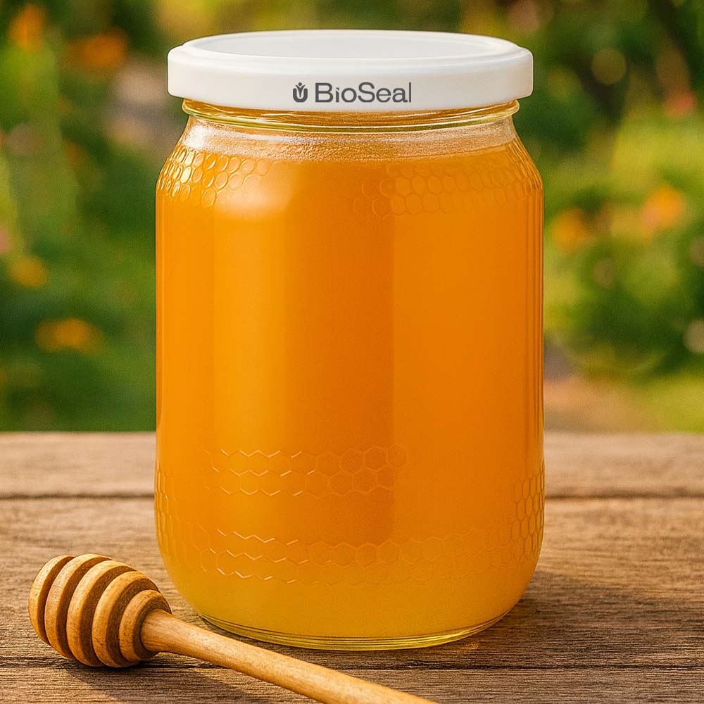 Szklany słoik na miód o pojemności 1260 g z białą zakrętką BioSeal UNiTWIST. Minimalistyczna, czysta estetyka doskonale pasuje do sprzedaży bezpośredniej i zestawów rodzinnych.