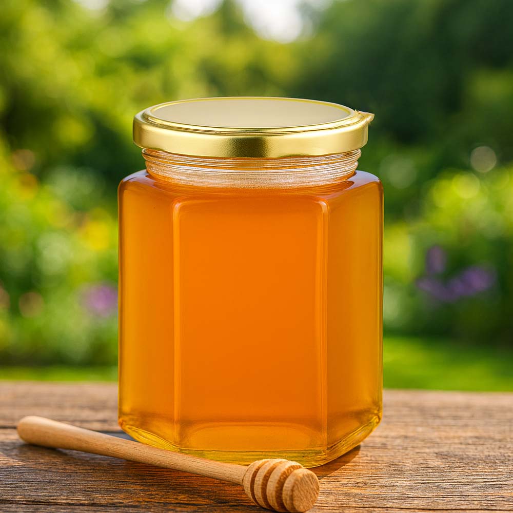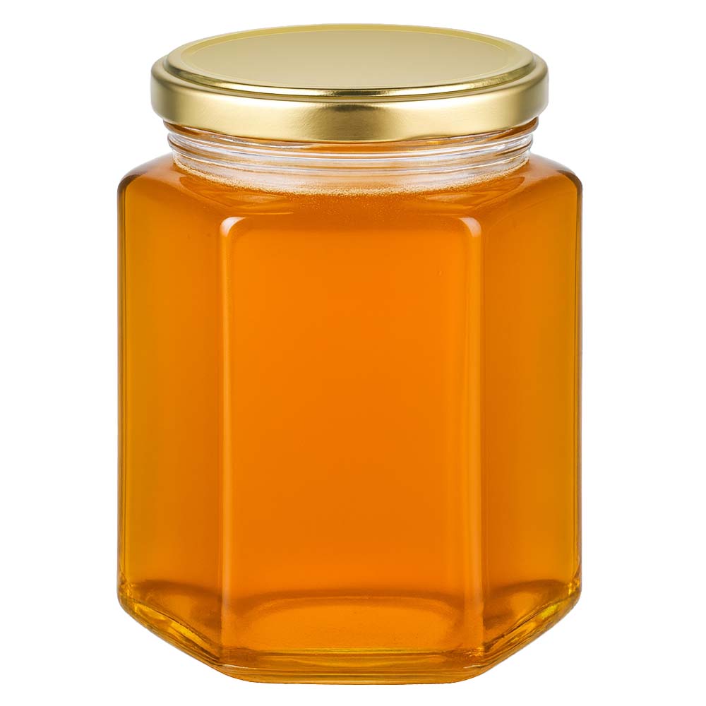 Wytrzymały szklany słoik na miód o pojemności 250 g ze złotą zakrętką BasicSeal UNiTWIST. Doskonały do sprzedaży, zestawów prezentowych i estetycznego pakowania miodu.
