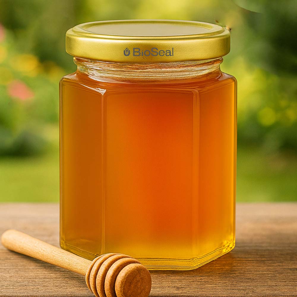 Szklany słoik na miód o pojemności 250 g ze złotą zakrętką BioSeal UNiTWIST. Świetnie nadaje się do sprzedaży bezpośredniej, klasycznych porcji miodu i eleganckich zestawów prezentowych.