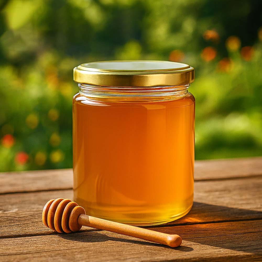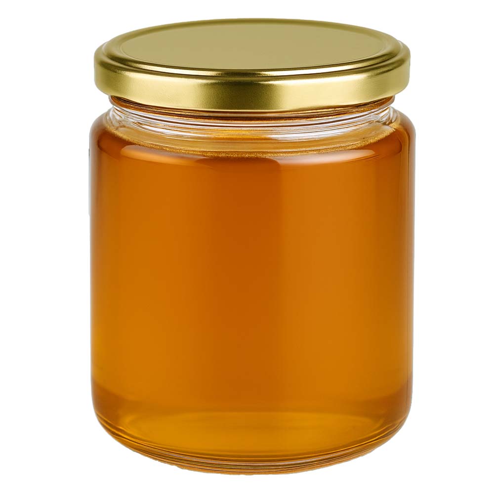 Szklany słoik na miód o pojemności 350 g ze złotą zakrętką BasicSeal UNiTWIST. Doskonały do sprzedaży bezpośredniej, zestawów prezentowych i średnich ilości miodu.