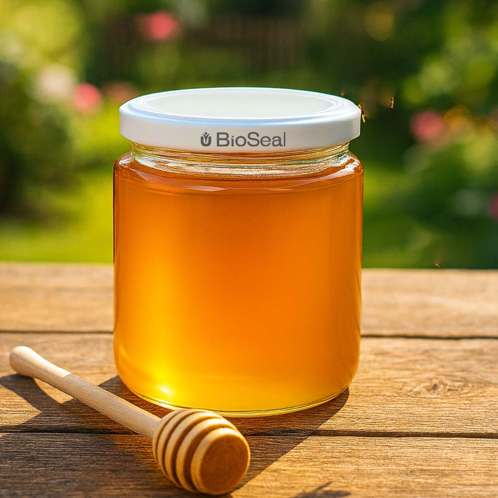 Szklany słoik na miód o pojemności 350 g z białą zakrętką BioSeal UNiTWIST. Minimalistyczny i elegancki wygląd świetnie sprawdza się w sprzedaży bezpośredniej oraz zestawach prezentowych.
