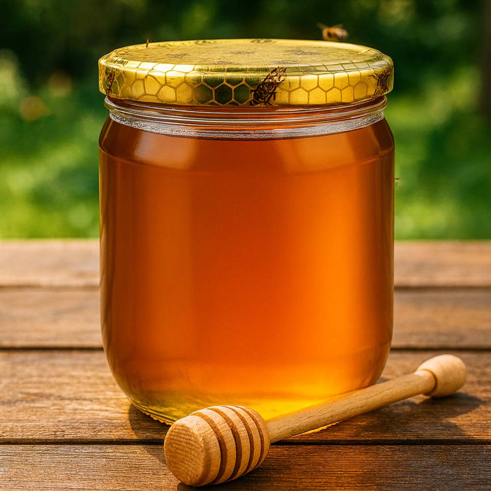 Szklany słoik na miód o pojemności 500 g z ozdobnym wieczkiem z motywem plastra miodu BasicSeal UNiTWIST. Wzór plastra podkreśla naturalny charakter miodu i świetnie wygląda na półce sklepowej oraz w zestawach prezentowych.