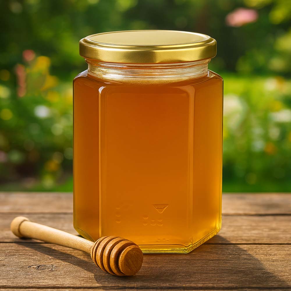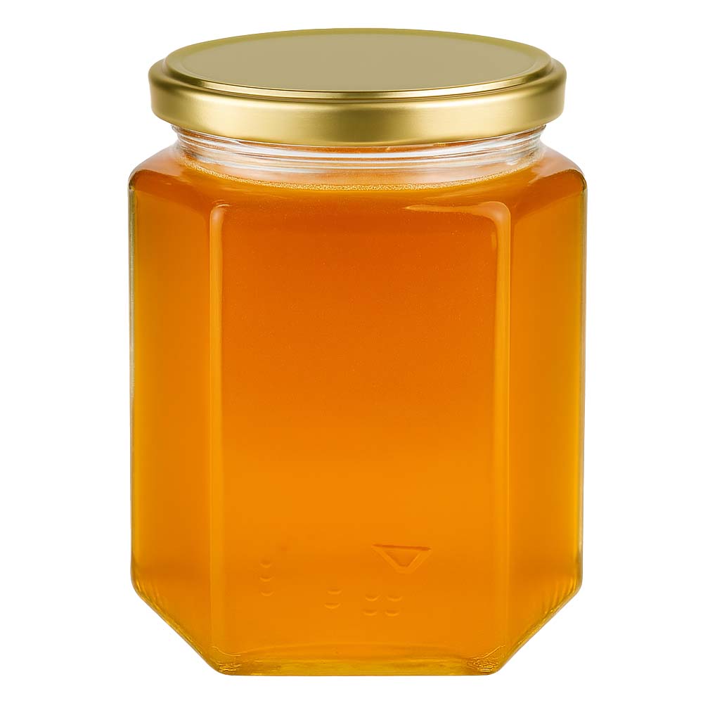 Szklany słoik na miód o pojemności 500 g ze złotą zakrętką BasicSeal UNiTWIST. Wytrzymała konstrukcja i elegancki wygląd czynią go świetnym wyborem do sprzedaży bezpośredniej oraz większych porcji miodu.